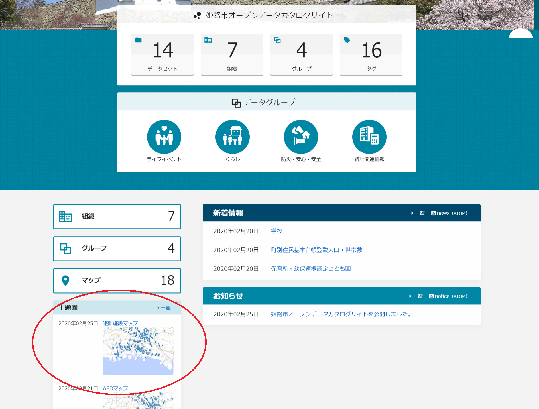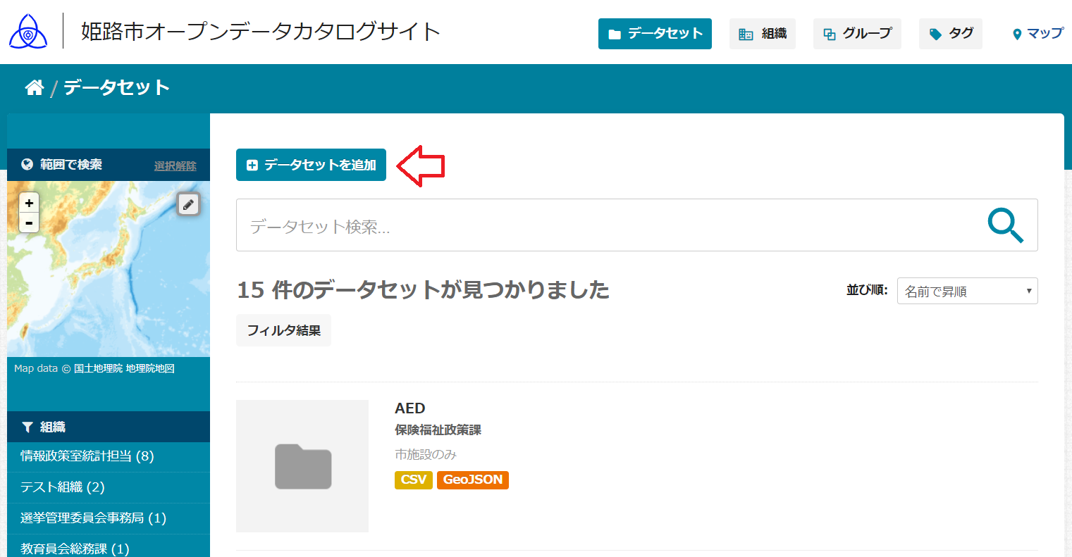 姫路市のオープンデータカタログサイトでは基本的なデータカタログ機能の他に空間データ(位置情報を持つデータ)を可視化する機能も併せ持ち、空間データを含む様々なオープンデータを取り扱うことが可能となっております。