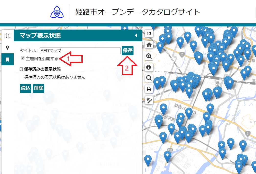「保存済みの表示状態」の欄に以前保存した主題図の一覧が表示されます。もう一度表示したい主題図を選択して「読込」をクリックすると、再読み込みすることができます。