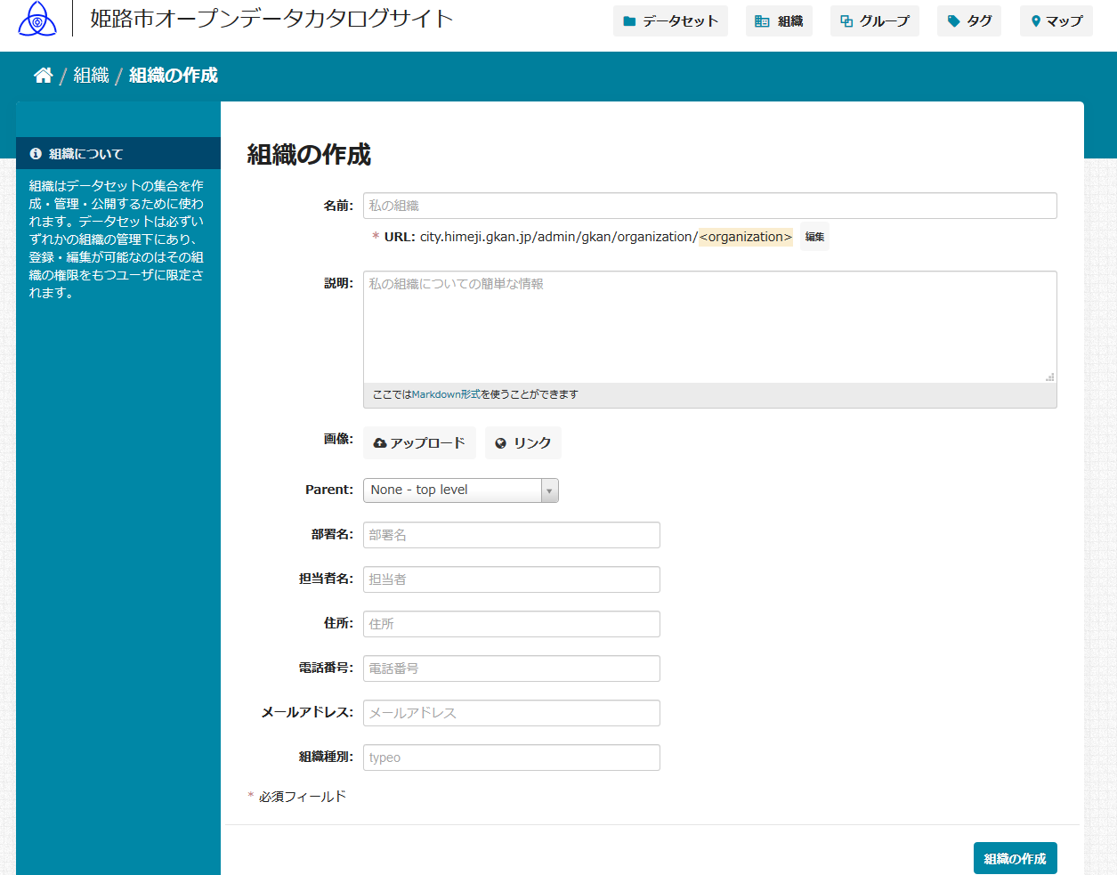 組織を新しく作成するには、上の「組織」をクリック → 「+ 組織を追加」をクリックします。ここで、組織の情報を入力します。URL のところの「編集」をクリックし、組織のページの URL の最後部分(半角英数)を決めてください。その他の項目も入力し、「組織の作成」をクリックします。